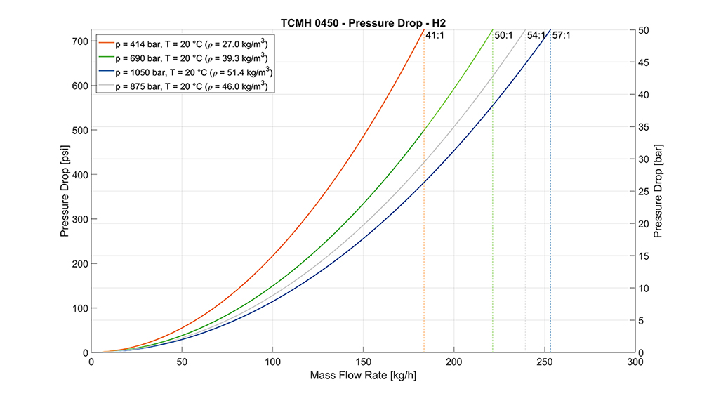 @ 20°C H2,壓降50 bar 254 kg/h @ 1050 bar, 9.30 lb/min @ 15,200 psi