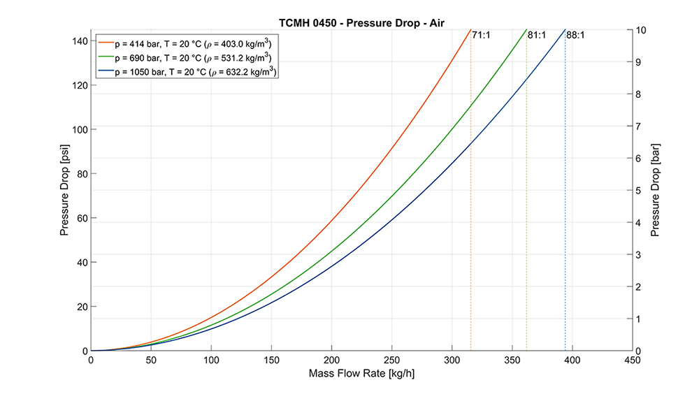 @ 20°C空氣,壓降10bar 394 kg/h @ 1050 bar, 14.5 lb/min @ 15,200 psi