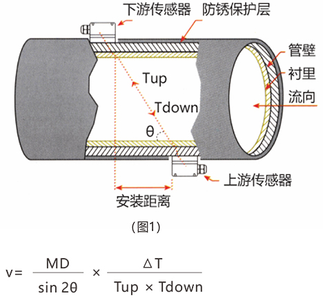 當(dāng)超聲波波速在液體中傳播時(shí),  液體的流動將使傳播時(shí)間產(chǎn)生微小變化,其傳播時(shí)間的變化正比于液體的流速、零流量時(shí)、兩個(gè)傳感器發(fā)射和接受聲波所需的時(shí)間完全相同 (可實(shí)際測量零流量的技術(shù)) 介質(zhì)流動時(shí),逆流方向的聲波傳輸時(shí)間大于水流方向的聲波傳輸時(shí)間。其關(guān)系符合面表達(dá)式: